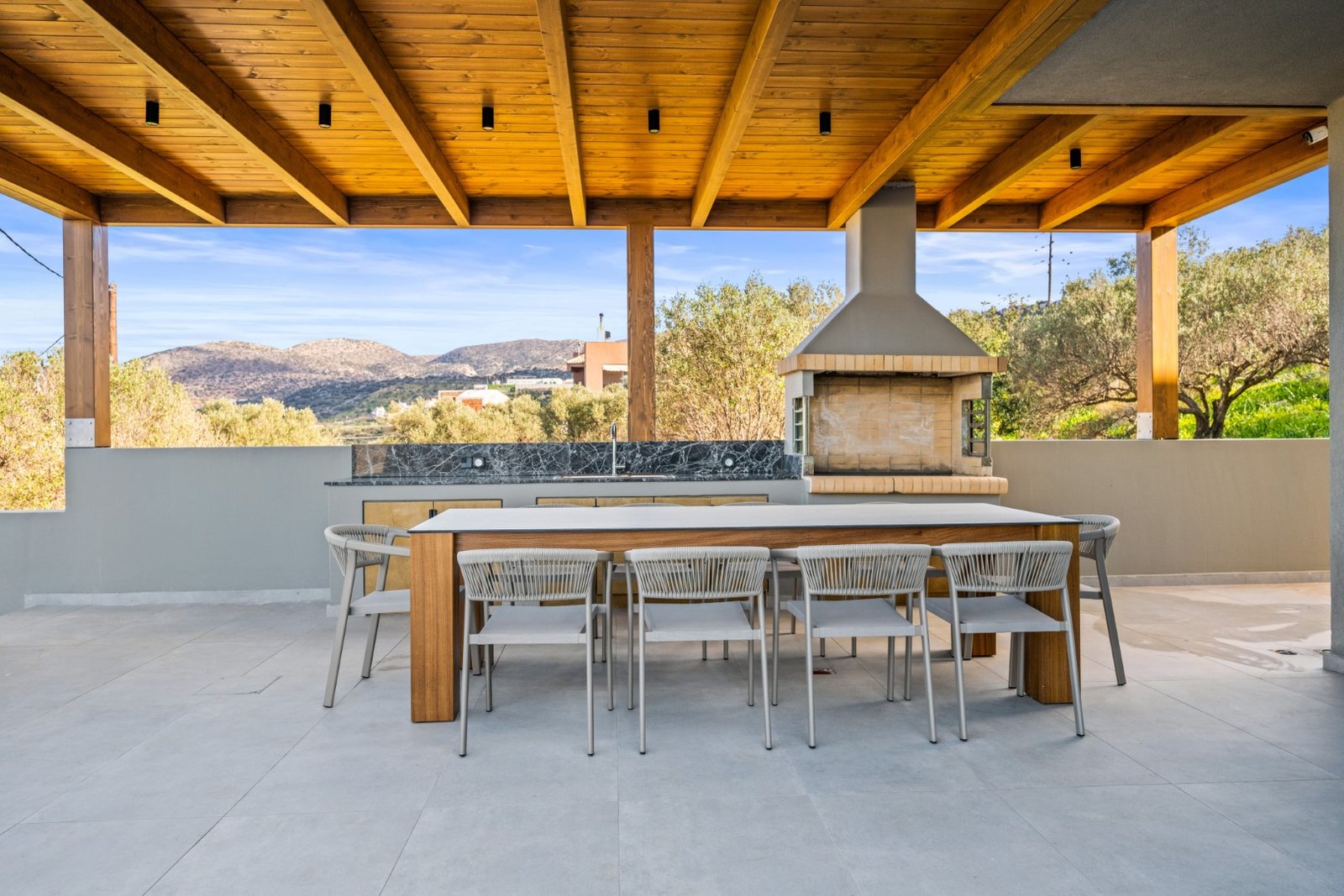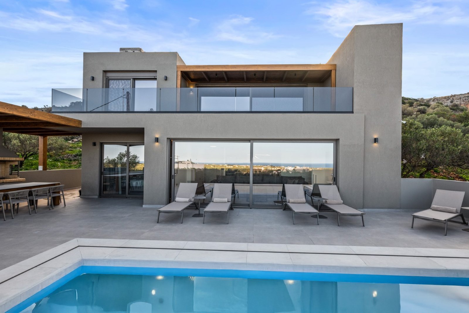 Ο εξωτερικός χώρος έχει σχεδιαστεί με στόχο την αρμονική ένταξη στο φυσικό περιβάλλον και περιλαμβάνει ιδιωτική πισίνα και χώρο BBQ, προσφέροντας ιδανικές συνθήκες χαλάρωσης, υπαίθριας διαβίωσης και απόλαυσης πανοραμικής θέας στη θάλασσα. Ο αρχιτεκτονικός σχεδιασμός δίνει έμφαση σε καθαρές γραμμές, μεγάλα ανοίγματα και οπτική συνέχεια μεταξύ εσωτερικών και εξωτερικών χώρων.